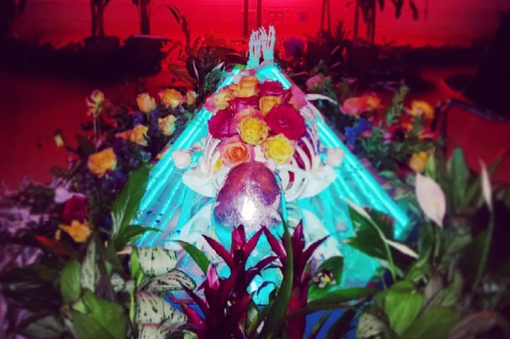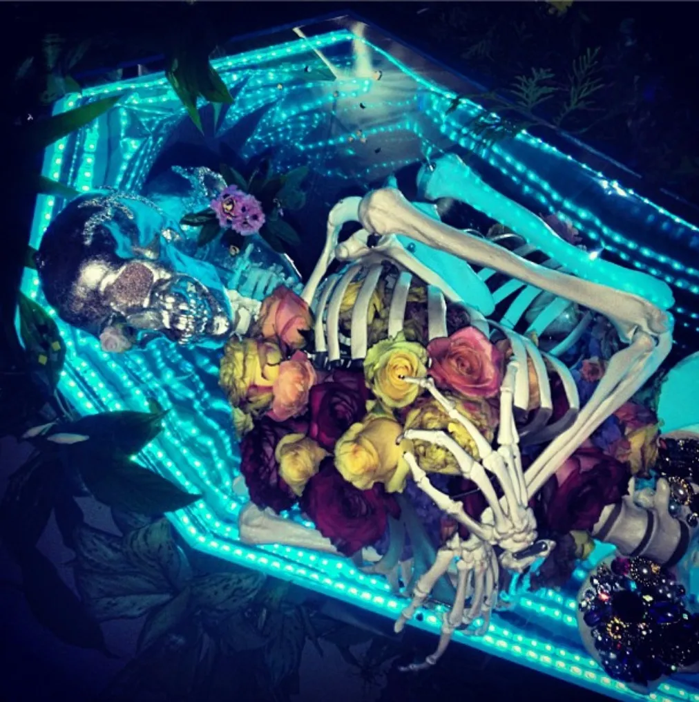Following the success of her workshop and skull art installation at Tate Modern (Jul 12), Baker was invited by Tate Britain to host a large-scale workshop and installation. For Tate Britain, Baker’s reinterpretation of the famous painting: Milias’ 1985 ‘Ophelia’, involved her making a 6-ft infinity-mirror coffin and an embellished ‘Ophelia’ skeleton. Baker filled a large room at Tate Britain with foliage and invited participants to enter a forest scene and use stones, twigs and bones to create embellished artworks (Sep 13).